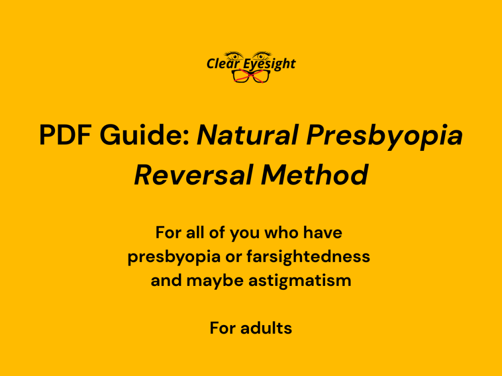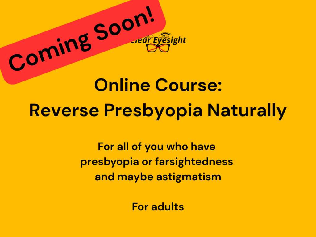 If you are an adult and have poor vision at a near objects (you wear a plus diopters, so you have farsightedness or presbyopia) and possibly astigmatism (cylinders on your glasses) and you want to regain clear and sharp eyesight naturally, you can start with: