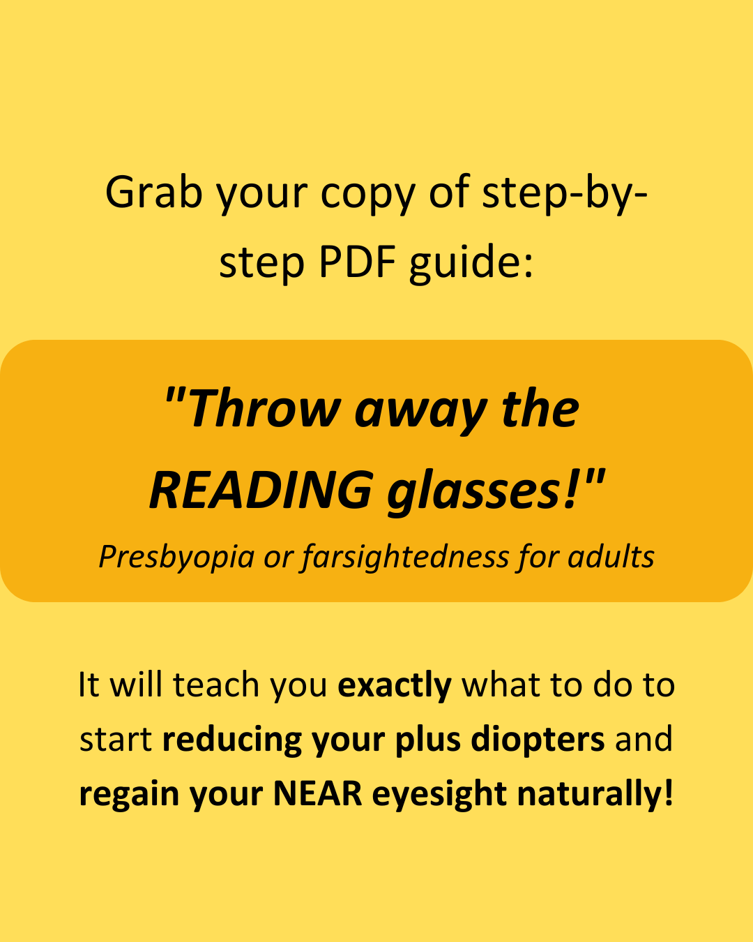I present you the most systematic and in-depth PDF guide or manual on the market that tells you step by step how to get rid of presbyopia or how to reduce and eliminate PLUS diopters and throw away the plus reading glasses (and astigmatism) for good and regain clear and sharp near eyesight naturally!